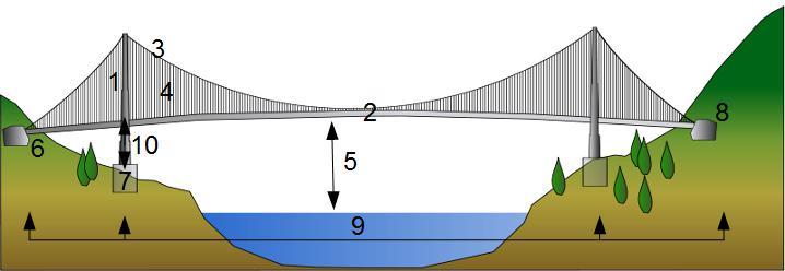 4) Suspentes : Câbles verticaux suspendant le tablier aux câbles porteurs.
